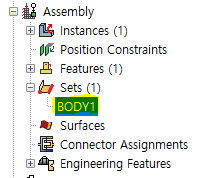 ELSET=BODY1 이라는 옵션을 추가했습니다. 정의한 요소를 set 으로 설정해준 것입니다. 이제 이 요소를 BODY1 이라는 이름으로 사용할 수 있습니다. CAE 상에서 보면 아래와 같이 Assembly 아래 Set 이 하나 생성된 것입니다.