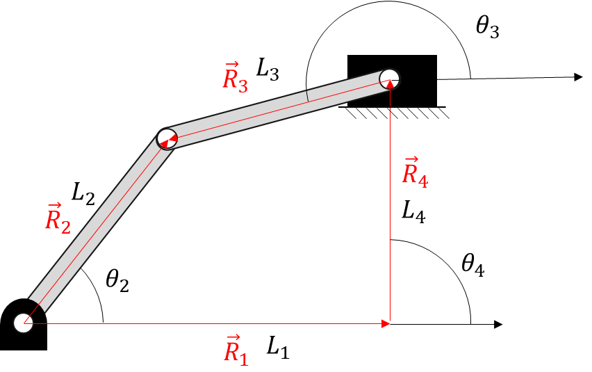 아래 그림과 같이 4절 크랭크-슬라이더가 있습니다. 주어진 값은 각 링크의 길이인 $L_{2}$,$L_{3}$,$L_{4}$와 $\theta_{2}$ 입니다. 이 값들을 이용하여 $\theta_{3}$ 와 L1을 구하는 것이 목적입니다.