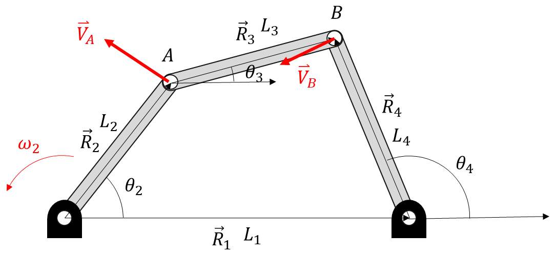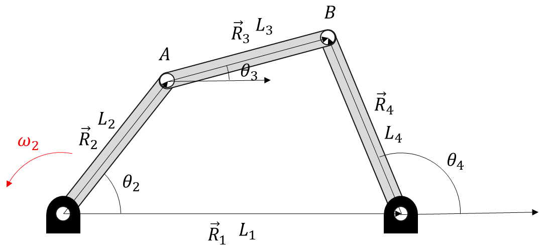 길이와 각도들은 모두 알고 있습니다. 속도 중에서는 $\omega_{2}$ 만 알고 있는 상황입니다. 이때 $\omega_{3}$와 $\omega_{4}$ 를 구하는 것이 목적입니다.