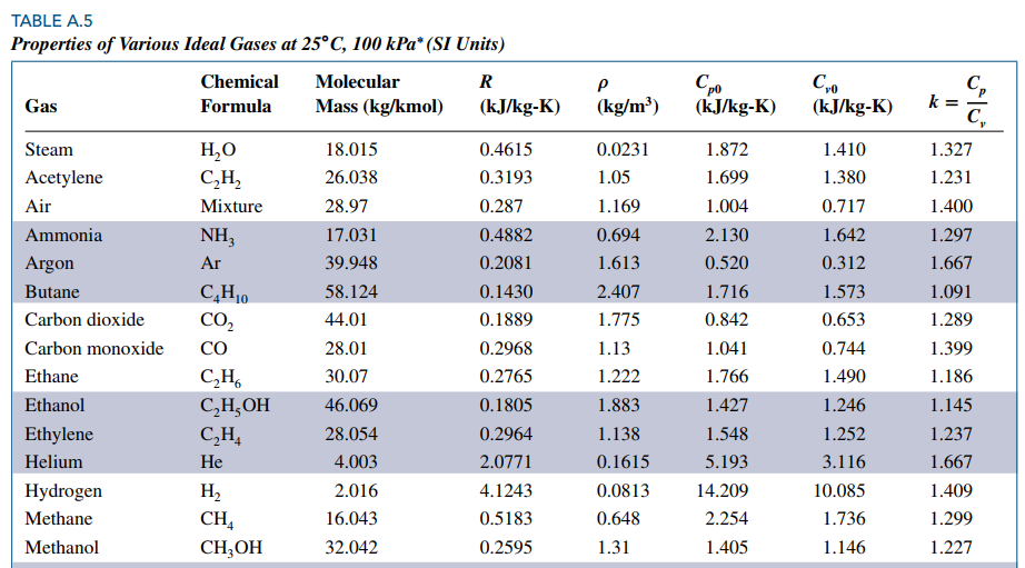 기체상수를 몰 질량으로 나눈 값을 mass-specific gas constant 라고 부릅니다. 이 값은 기체 종류에 따라 달라집니다. sonntag 열역학 책의 표 A.5 에 나옵니다. 아래는 일부 발췌입니다.