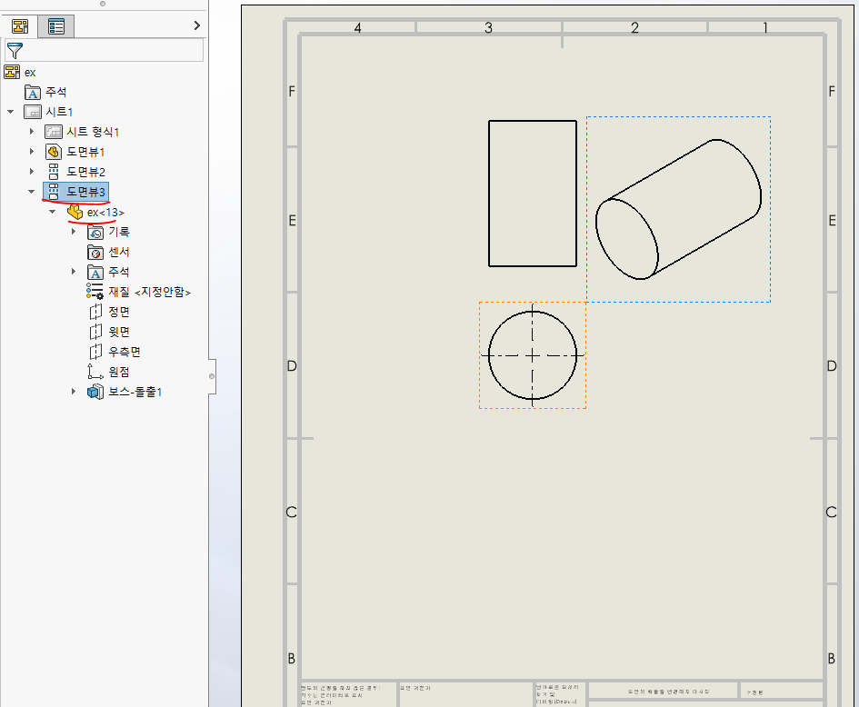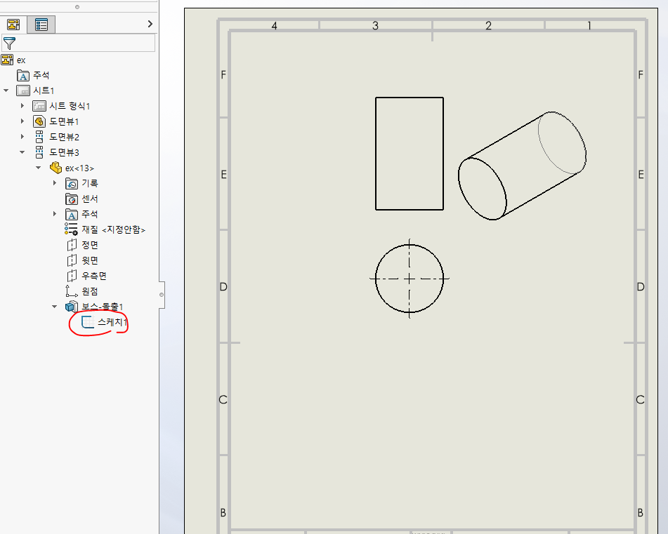 1) 왼쪽 트리에서 스케치를 넣기 원하는 도면뷰를 열고, 하위 카테고리에 있는 모델도 열어줌