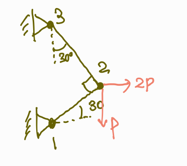 "노두 2에는 x방향으로 2P, y방향으로 -P 만큼의 힘이 작용한다"