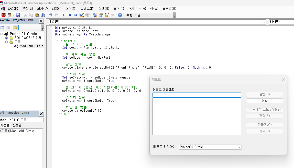 | [솔리드웍스 VBA] 2-1. 원그리기 예제 코드 뜯어보기 (1) Dim 이란? (0) | 2025.03.24 |